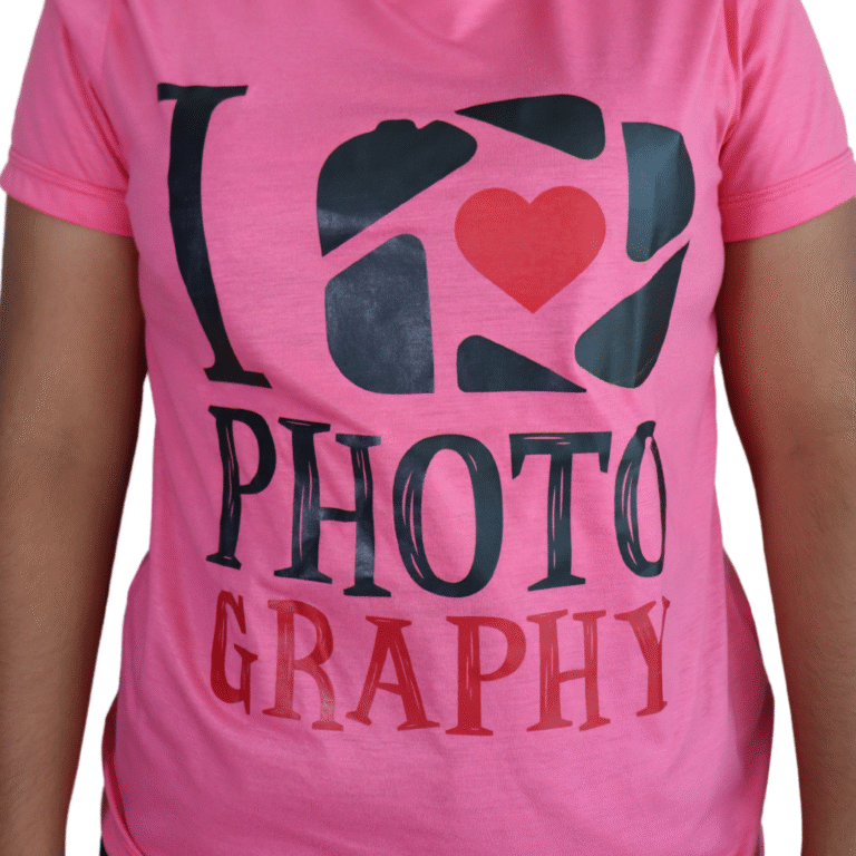 Camiseta feminina I love photo graphy meia malha pv rosa pink