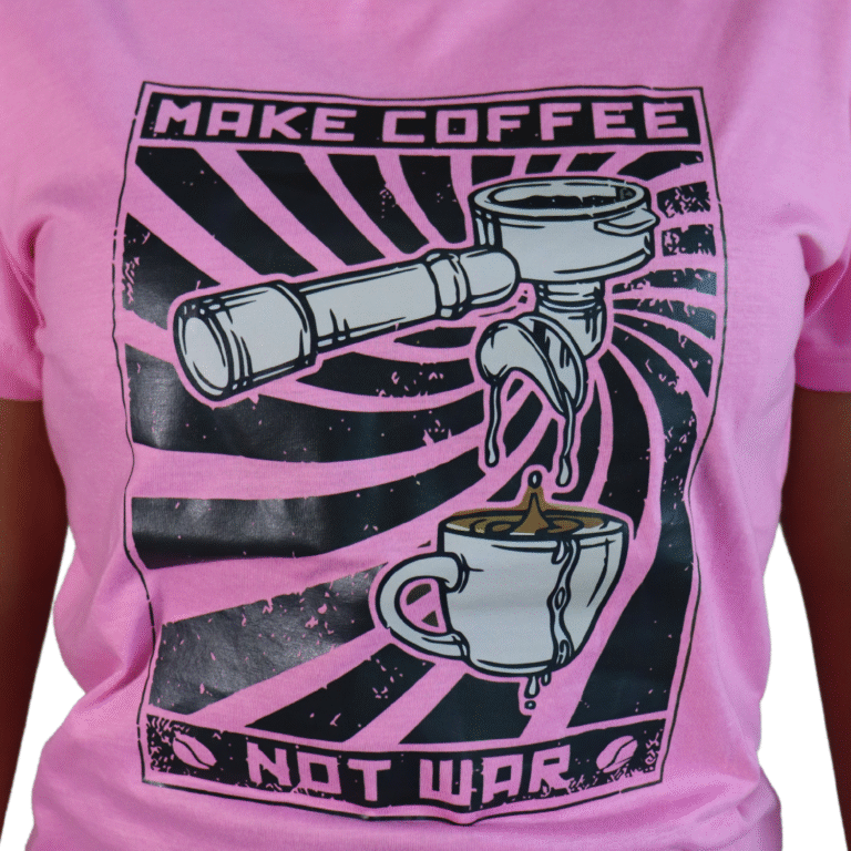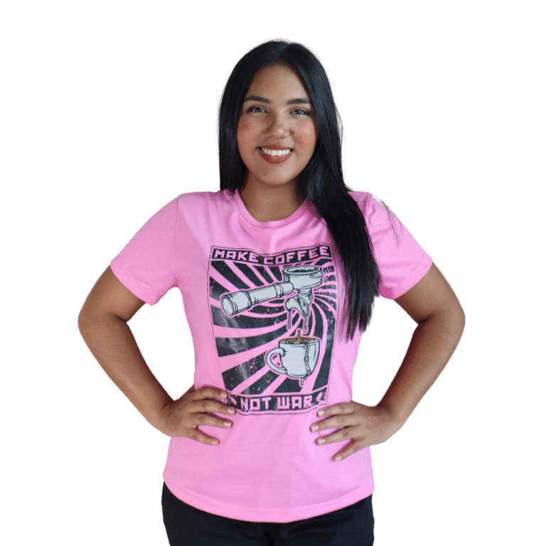 Camiseta feminina Make coffee not war malha pv rosa tutti frutti